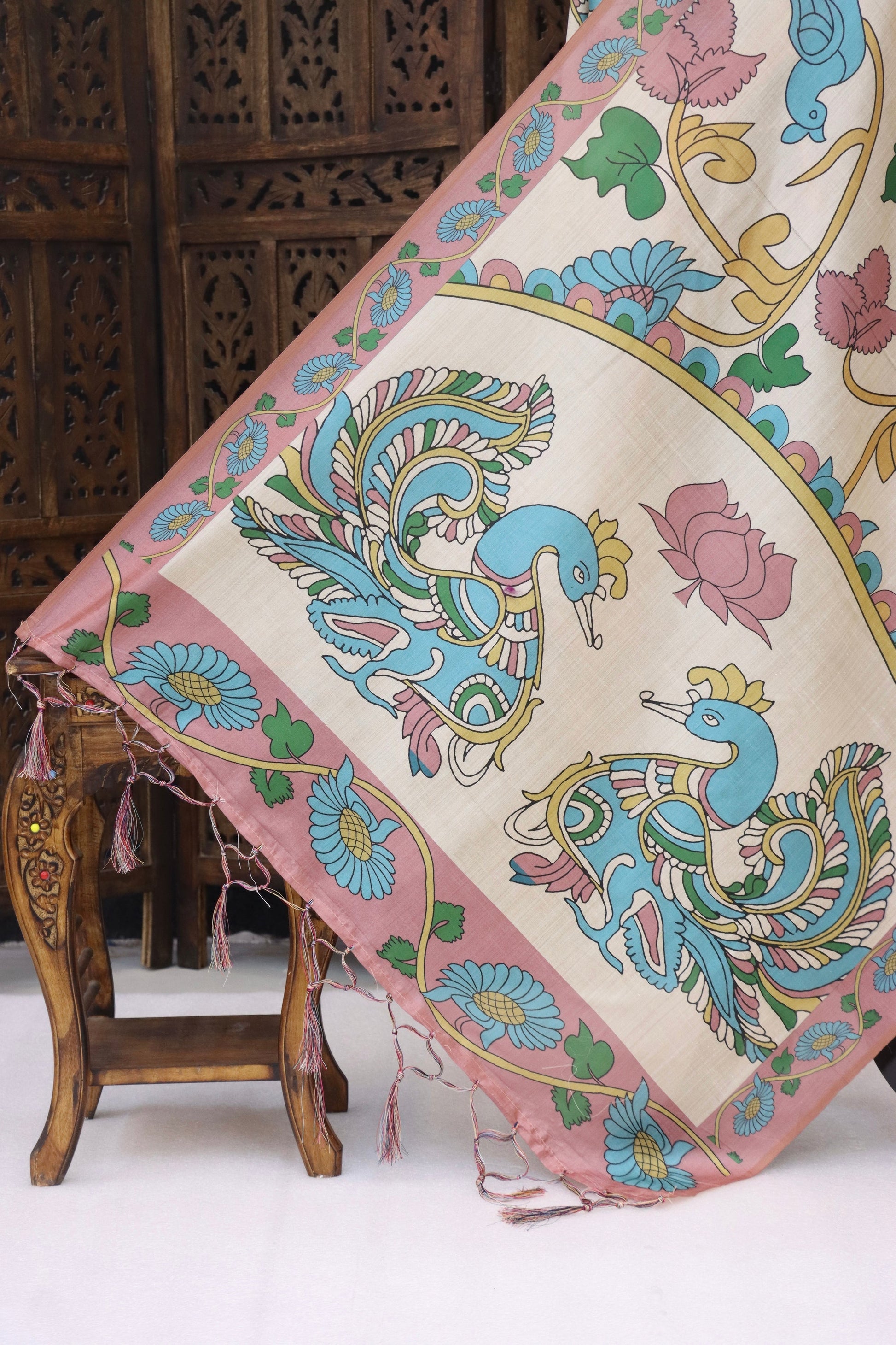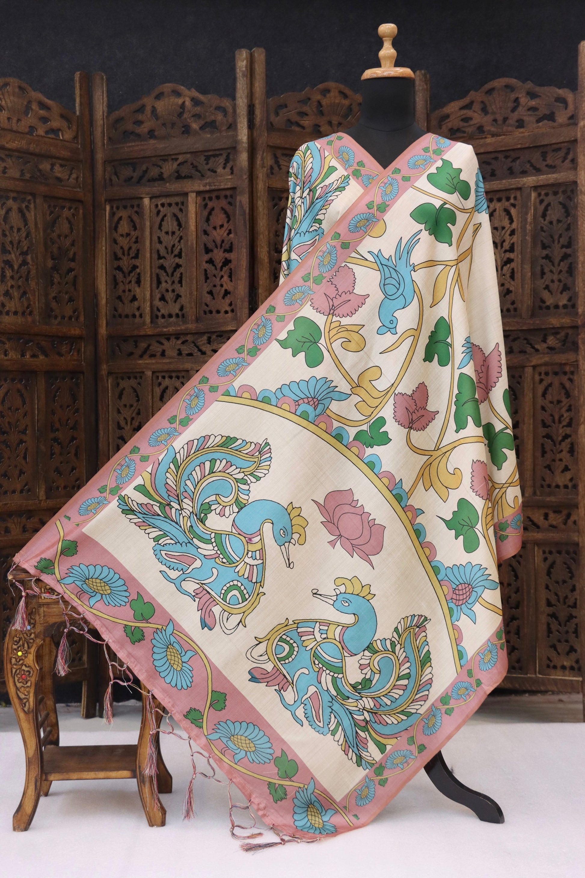 Design: Floral vine body with peacock motif statement panel