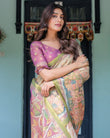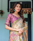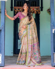 Paired with a woven violet blouse adorned with subtle floral and buti motifs, this saree is perfect for those who adore storytelling through attire.