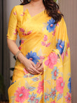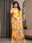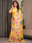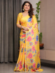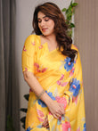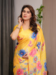Crafted from premium satin georgette fabric, the saree features a rich mustard yellow base adorned with large multicolour floral prints in refreshing shades of royal blue, coral pink, and soft green. The bold floral artwork is beautifully balanced across the saree, creating a lively yet refined designer appeal.
