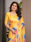 Mustard Yellow Satin Georgette Floral Printed Saree with Attached Blouse – Vibrant Garden Bloom Designer Drape