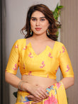 The satin georgette fabric offers a silky smooth texture, lightweight feel, and fluid fall, ensuring comfort and elegance throughout the day. This saree comes with a coordinated attached blouse in matching mustard yellow, featuring complementary floral detailing and a stylish back design that enhances the overall look.