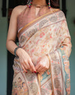 Celebrate tradition with this Pure Linen Cotton Handloom Printed Saree in a classic ivory hue, adorned with delicate floral motifs and a captivating festive procession pallu. Exquisitely designed, this saree blends artisanal craftsmanship with contemporary elegance, making it a perfect choice for all occasions.