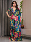 Teal Blue Satin Georgette Lotus Medallion Printed Saree with Attached Blouse – Multicolour Floral Designer Drape