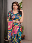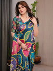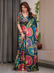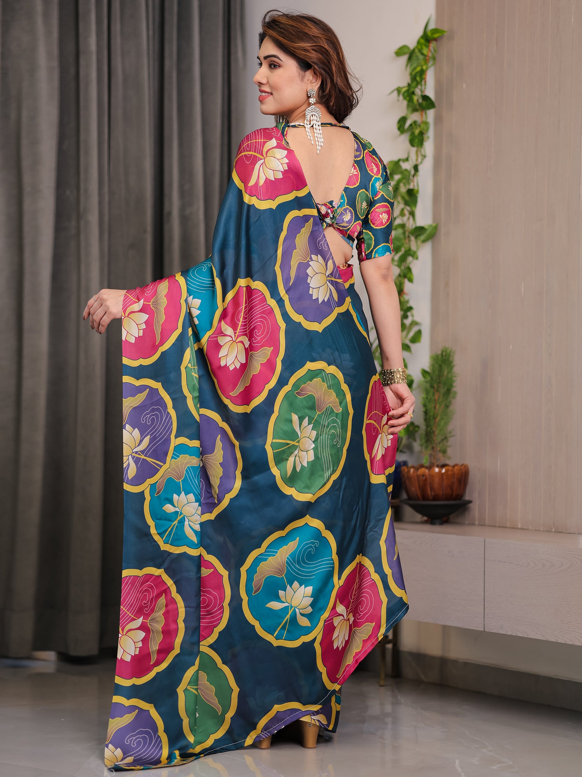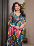 Crafted from premium satin georgette, the saree features a rich teal blue base adorned with large lotus-inspired medallion prints in vibrant shades of pink, mustard yellow, olive green, and lavender. The circular floral motifs create a rhythmic visual flow across the saree, lending it a distinctive designer appeal that stands out effortlessly.