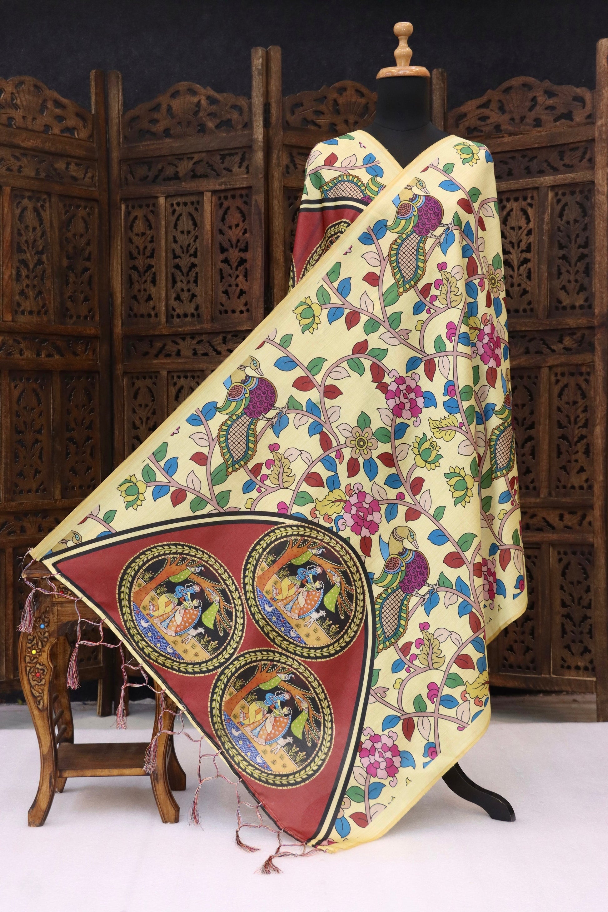 Lemon Yellow Malai Silk Dupatta with Peacock Vine Print & Circular Folk Art Pallu