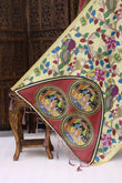 The highlight of this piece lies in its striking deep maroon circular folk art pallu, showcasing traditional narrative motifs framed within ornamental borders. These artistic medallions add depth and character, transforming the dupatta into a wearable canvas of Indian storytelling.