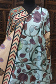 What sets this dupatta apart is its striking multi-pattern border, showcasing zigzag chevron lines, ornamental floral panels, and Kalamkari-inspired owl motifs symbolizing wisdom and heritage. The harmonious contrast of beige, teal, and earthy accents gives the dupatta a rich, layered look, while the hand-tied tassels add a refined artisanal finish.