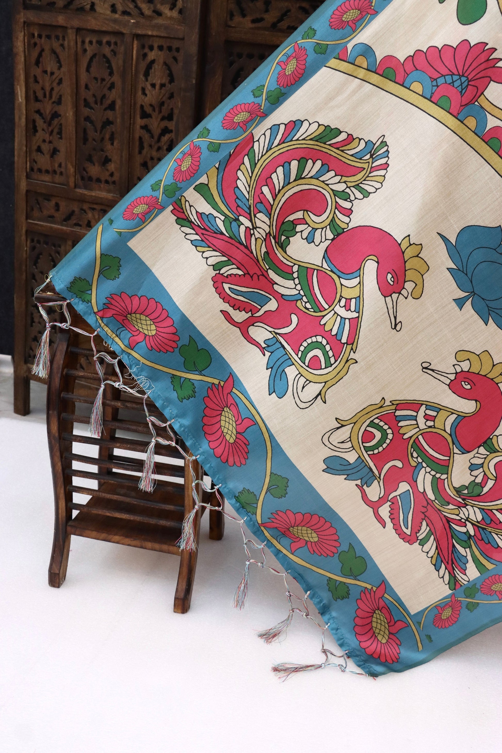 Ivory Malai Silk Dupatta with Turquoise Border & Twin Bird Kalamkari Motifs – Handcrafted Floral Ethnic Elegance