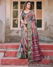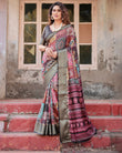 Step into sophistication with this vibrant multicolor Tussar silk saree, adorned with an eclectic mix of patchwork-inspired motifs in shades of maroon, teal, coral, and gold. The saree features an intricate olive green zari border with traditional paisley and floral patterns, adding a touch of regal charm. The pallu showcases a harmonious blend of geometric and ornamental motifs, creating a striking balance of modern artistry and timeless tradition. Perfect for weddings, festive gatherings, and cultural celebrations, this saree is finished with tassels, making it a statement piece for any grand occasion.