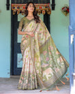 Olive Green & Ivory Handloom Cotton Saree with Lotus Blooms and Royal Elephant Motifs