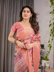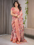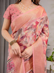 Step into effortless grace with this elegant peach pink cotton linen saree, designed to balance traditional charm with contemporary finesse. The body features a stunning digital print of watercolor-style floral patterns in shades of crimson, mauve, and ivory, gently cascading like soft petals.