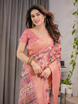 Peach Pink Cotton Linen Saree with Zari Border & Tribal Pallu | Floral Print | With Blouse