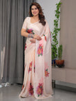Blush Peach Satin Georgette Floral Printed Saree with Attached Blouse – Soft Pastel Designer Saree for Elegant & Festive Wear