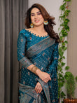 Peacock Teal Fendi Satin Block & Foil Printed Saree with Traditional Motifs, Tassel Edges & Attached Blouse