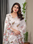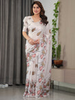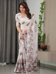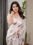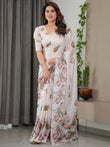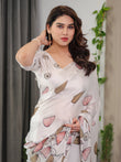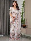 The saree features beautifully detailed floral digital prints that flow seamlessly across the body and pallu, creating a soft, feminine silhouette with a contemporary touch. Its fluid texture ensures easy pleating and a flattering fall, enhancing your natural grace with every step.