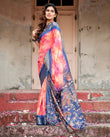 Grace any occasion in this vibrant pink and blue digital printed saree, a stunning blend of contemporary and traditional aesthetics. The saree boasts a dreamy watercolor-inspired pink base transitioning seamlessly into a deep blue, adorned with intricate peacock motifs and floral detailing.