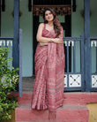 This beautiful rust red pure cotton linen saree features an intricate floral block print in shades of navy and cream, offering a traditional yet contemporary appeal. The elegant pallu is adorned with detailed ethnic patterns, adding depth to the design. Paired with a matching blouse, this saree is perfect for festive occasions and casual events alike. The tassels along the edges enhance the overall charm of the saree, giving it a timeless and graceful finish.