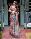 This sophisticated charcoal black pure cotton linen saree features an intricate leafy paisley print in warm shades of coral and beige, creating a bold yet elegant design. The pallu is adorned with detailed geometric patterns in olive green and coral, adding a modern touch to this traditional ensemble. Paired with a matching blouse, the saree is completed with delicate tassels along the pallu, perfect for making a statement at both casual and festive occasions.