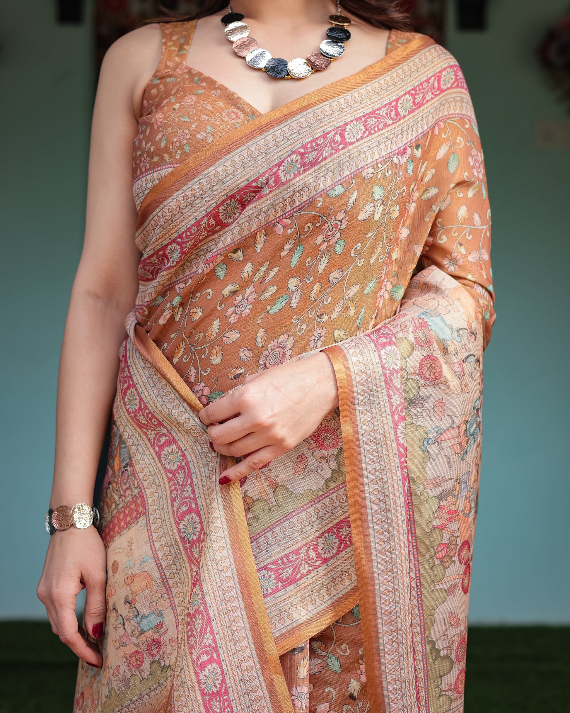 Discover timeless elegance with this Pure Linen Cotton Handloom Printed Saree in a captivating warm gold shade, adorned with intricate floral and figurative patterns. This saree perfectly blends traditional craftsmanship with a contemporary aesthetic, making it a must-have for every ethnic wardrobe.