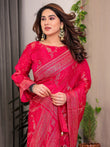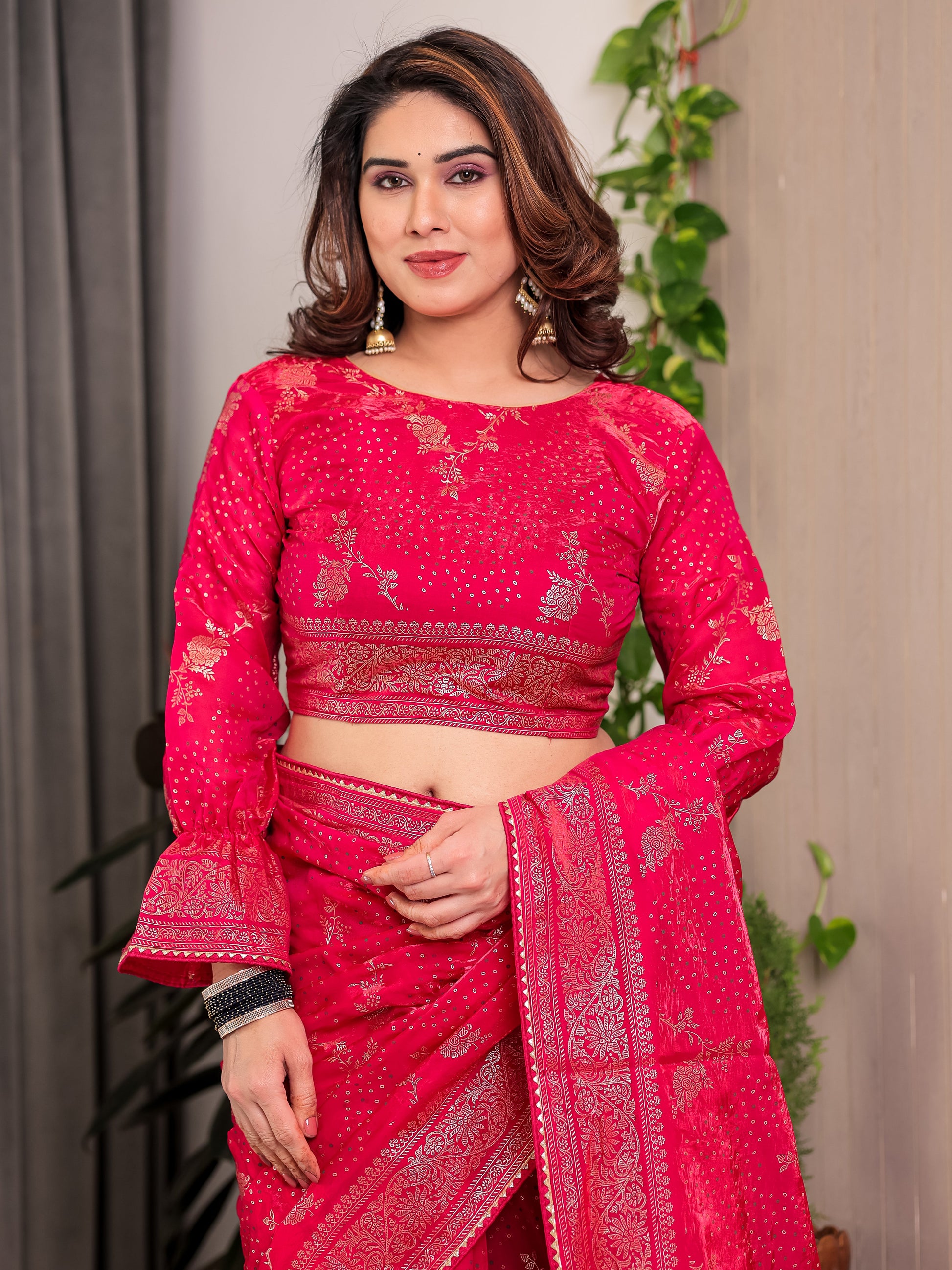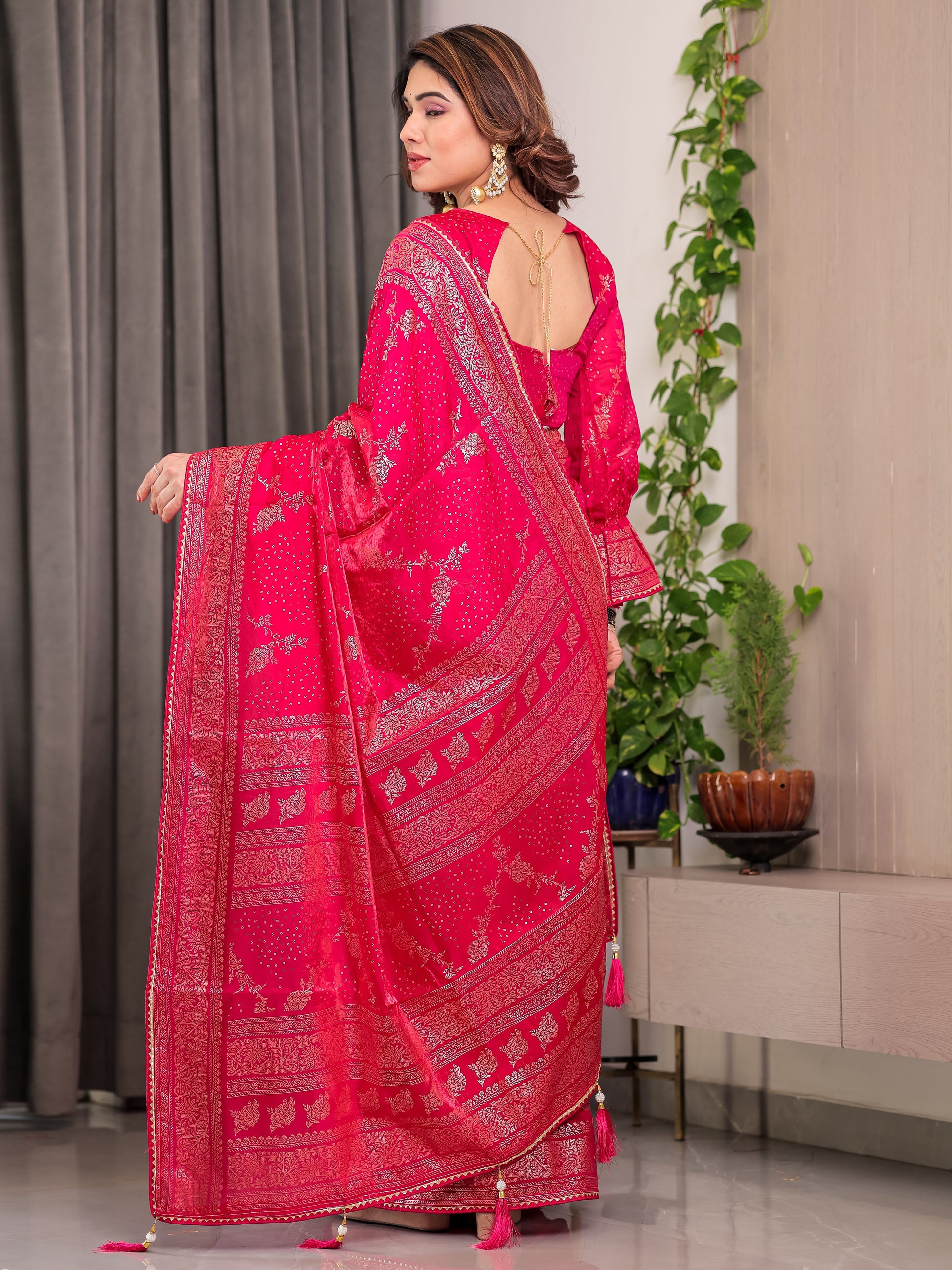 Rani Pink Fendi Satin Floral Block & Foil Printed Saree with Ornamental Border, Tassel Edges & Attached Blouse
