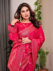 Finished with decorative tassels on the edges, this saree reflects fine craftsmanship and graceful movement. It comes with a matching attached blouse piece, thoughtfully designed to complement the saree’s vibrant tone and intricate pattern for a complete, coordinated ethnic look.