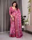 Rani Pink Pure Handloom Linen Saree with White Floral Print & Dual Zari Border | Elegant Tassel Finish | 5.5m Saree + 0.8m Blouse