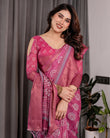 It comes with a coordinated 0.8-meter unstitched blouse piece featuring matching floral motifs, allowing for customized tailoring into sleeveless, V-neck, or elbow-sleeve blouses for a flattering silhouette.