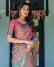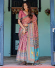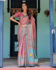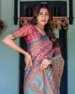 Paired with a solid rosewood red blouse featuring printed border accents, this saree is perfect for cultural celebrations, festive gatherings, and elegant day events.