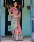 The highlight of the saree is its stunning pallu — featuring a pair of majestic Madhubani-style fish motifs over an aqua blue backdrop, symbolizing prosperity and harmony. Delicate lotus vines and temple border detailing frame the saree beautifully, adding to its cultural allure.