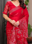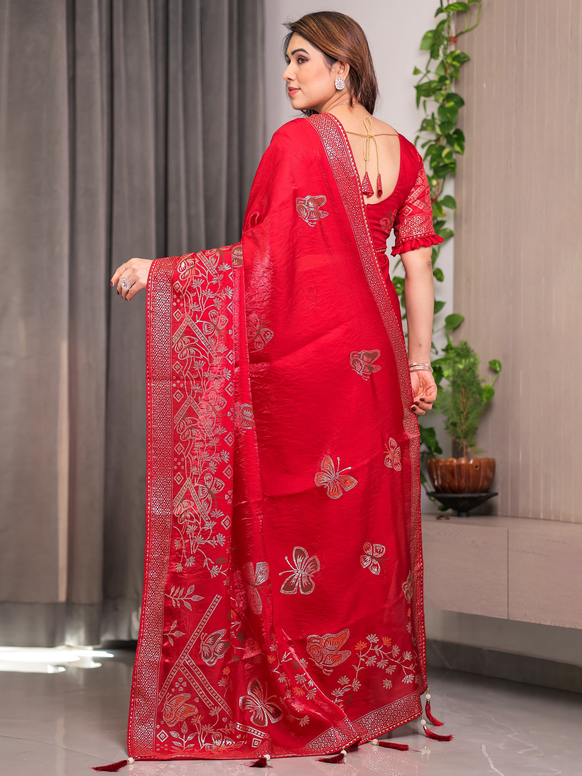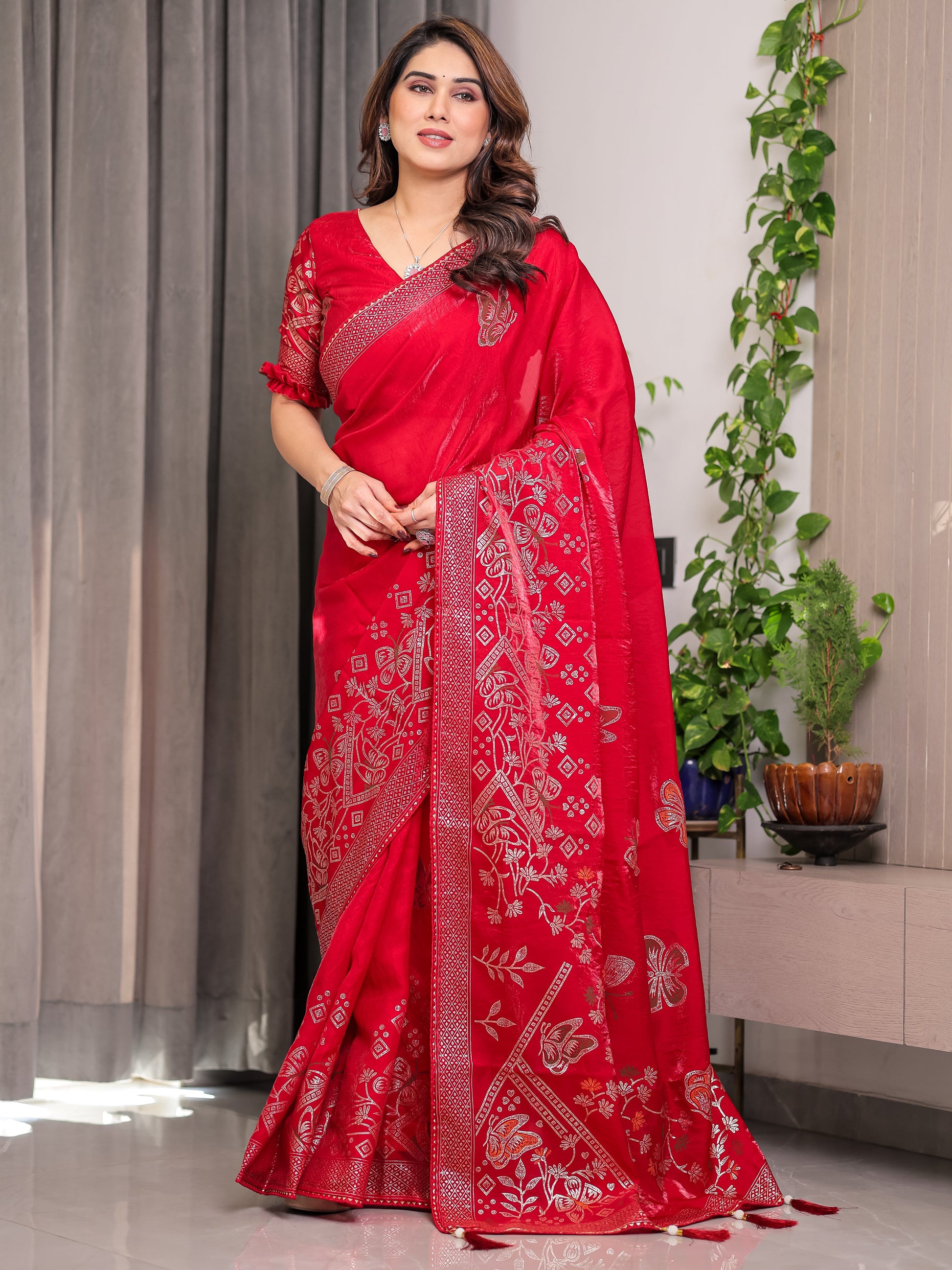 Ruby Red Fendi Satin Block & Foil Print Saree with Attached Blouse & Tassel Detailing