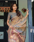 The ensemble is finished with multi-hued borders and golden tassels, making it a poetic blend of nostalgia, grace, and festive charm. Comes with an unstitched blouse in rust-brown with traditional motifs.