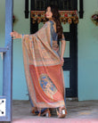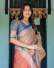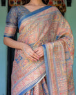Embrace heritage with poise in this stunning Rust & Blue Handloom Cotton Saree, beautifully adorned with intricate patchwork-style digital prints and a magnificent pallu featuring a classical dancing woman. The saree body is layered with a patchwork-inspired layout of floral vines, paisley, lotus motifs, and ornamental borders, capturing the vibrancy of Indian textile traditions.