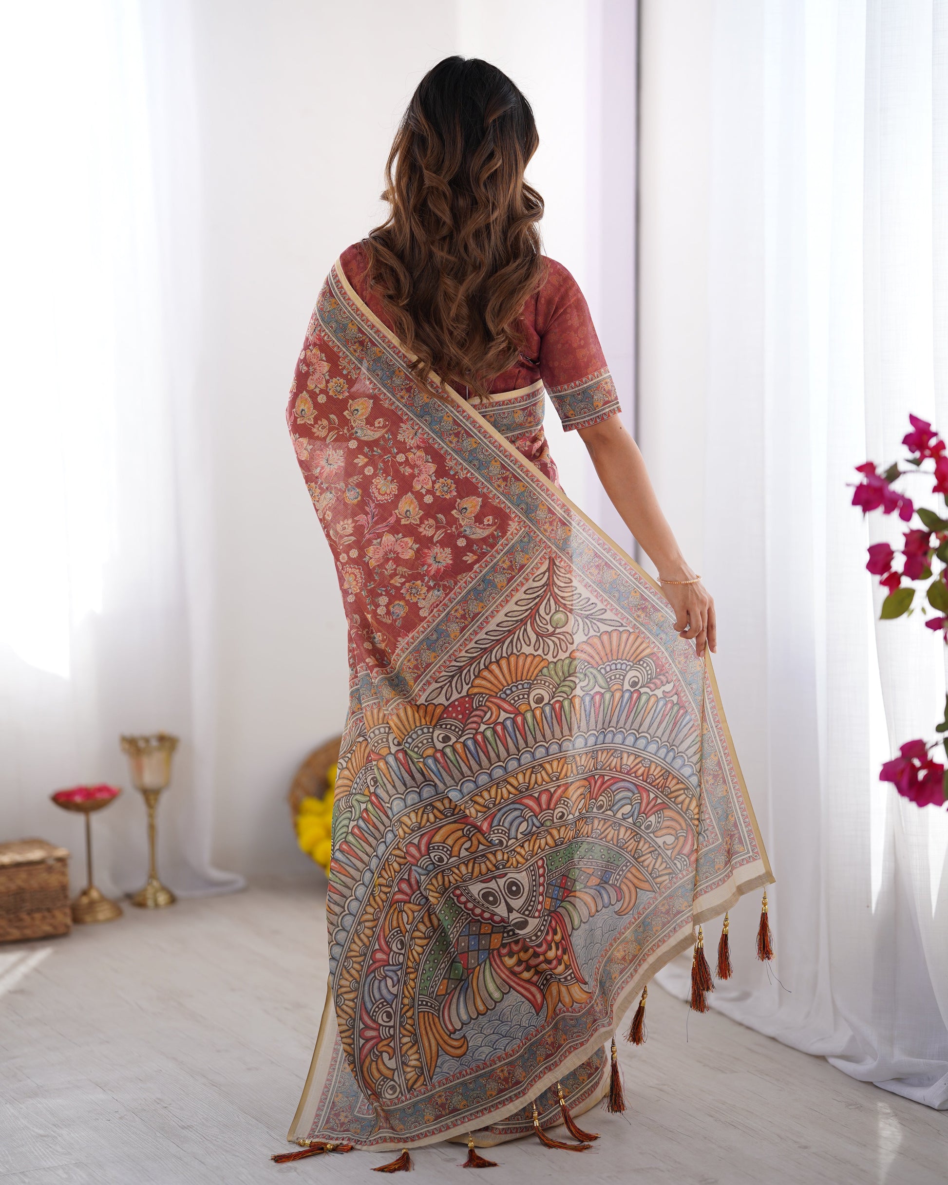 Tassels: Finished with deep rust tassels and golden bead accents