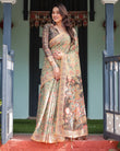 Sage Green with Bold Floral Motifs Linen Cotton Handloom Printed Saree, Vibrant Peacock Pallu, and Tassels