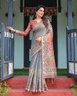 Slate Blue Handloom Cotton-Linen Saree with Vibrant Folk Motifs and Floral Pallu
