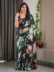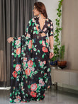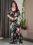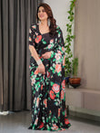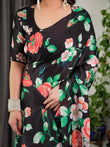 Black Floral Satin Georgette Saree with Multicolor Rose Print & Designer Tie-Back Blouse – Premium Soft Draping Saree