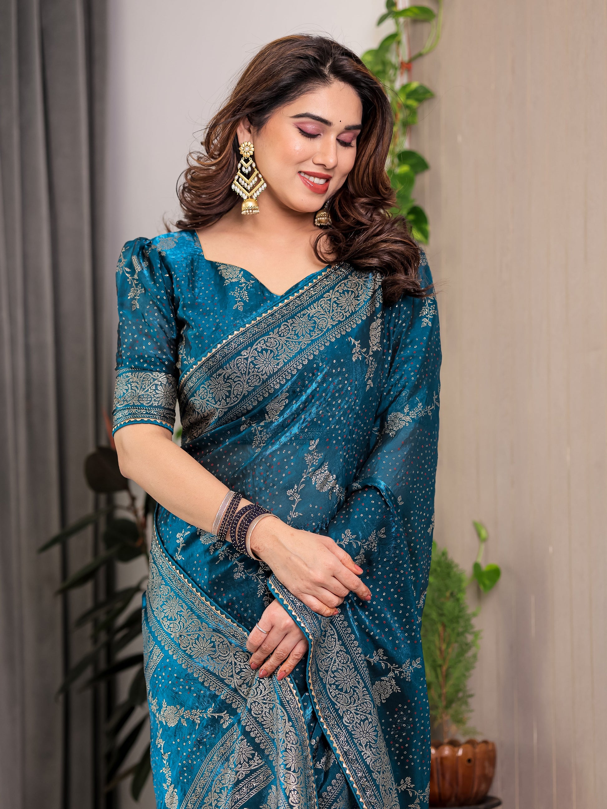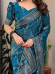 Teal Blue Fendi Satin Floral Block & Foil Printed Saree with Ornamental Border, Tassel Edges & Attached Blouse