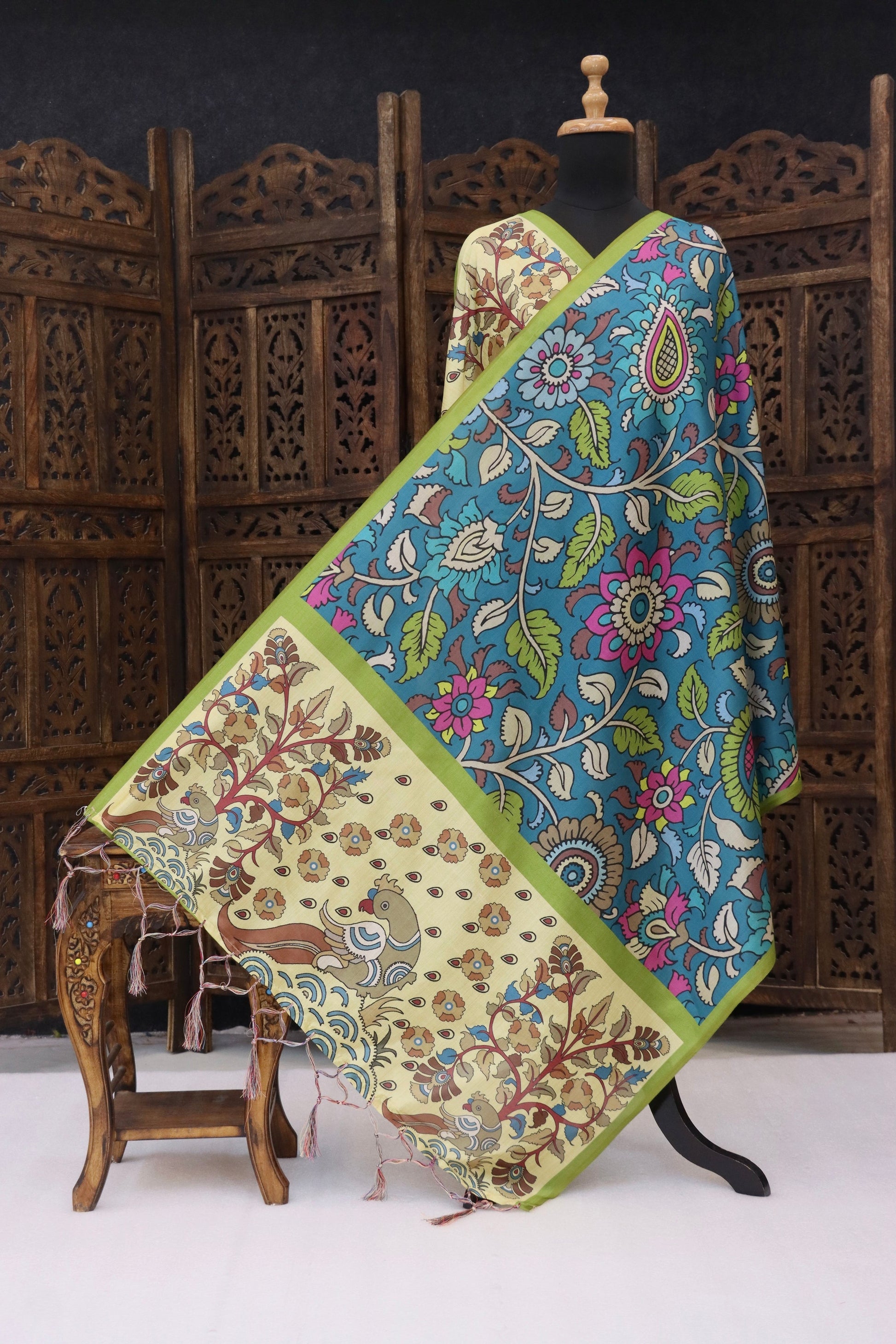 Teal Blue Malai Silk Dupatta with Floral Vine & Bird Motif Border – Handcrafted Folk Art Elegance