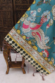 Teal Blue Malai Silk Dupatta with Peacock & Floral Print, Decorative Border and Tassel Detailing