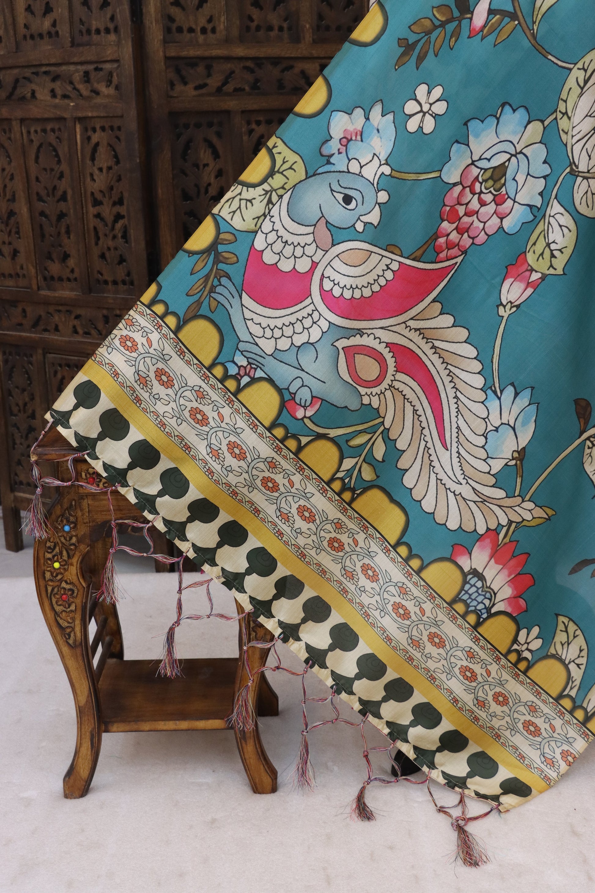 Color: Teal Blue with multicolor floral & peacock artwork