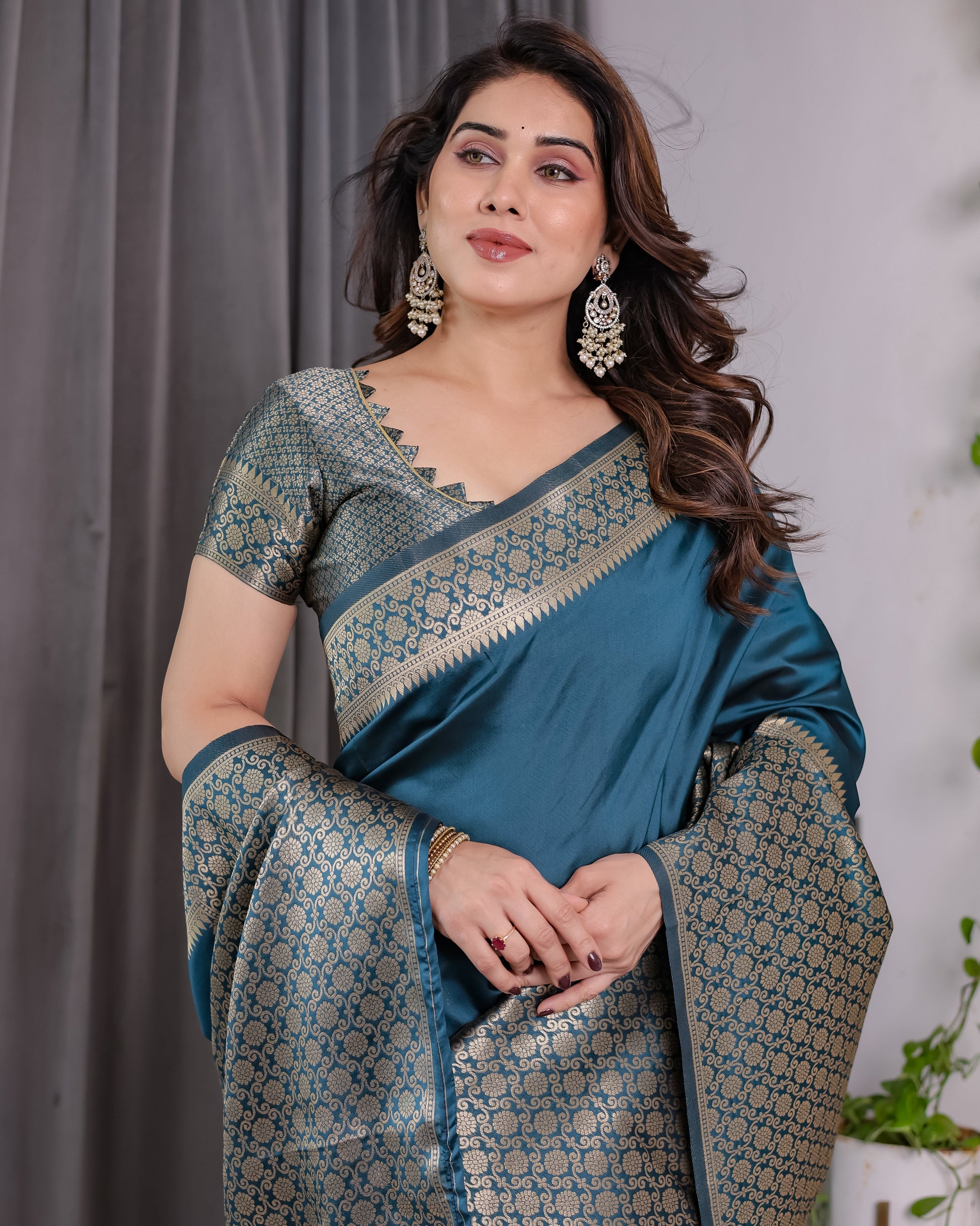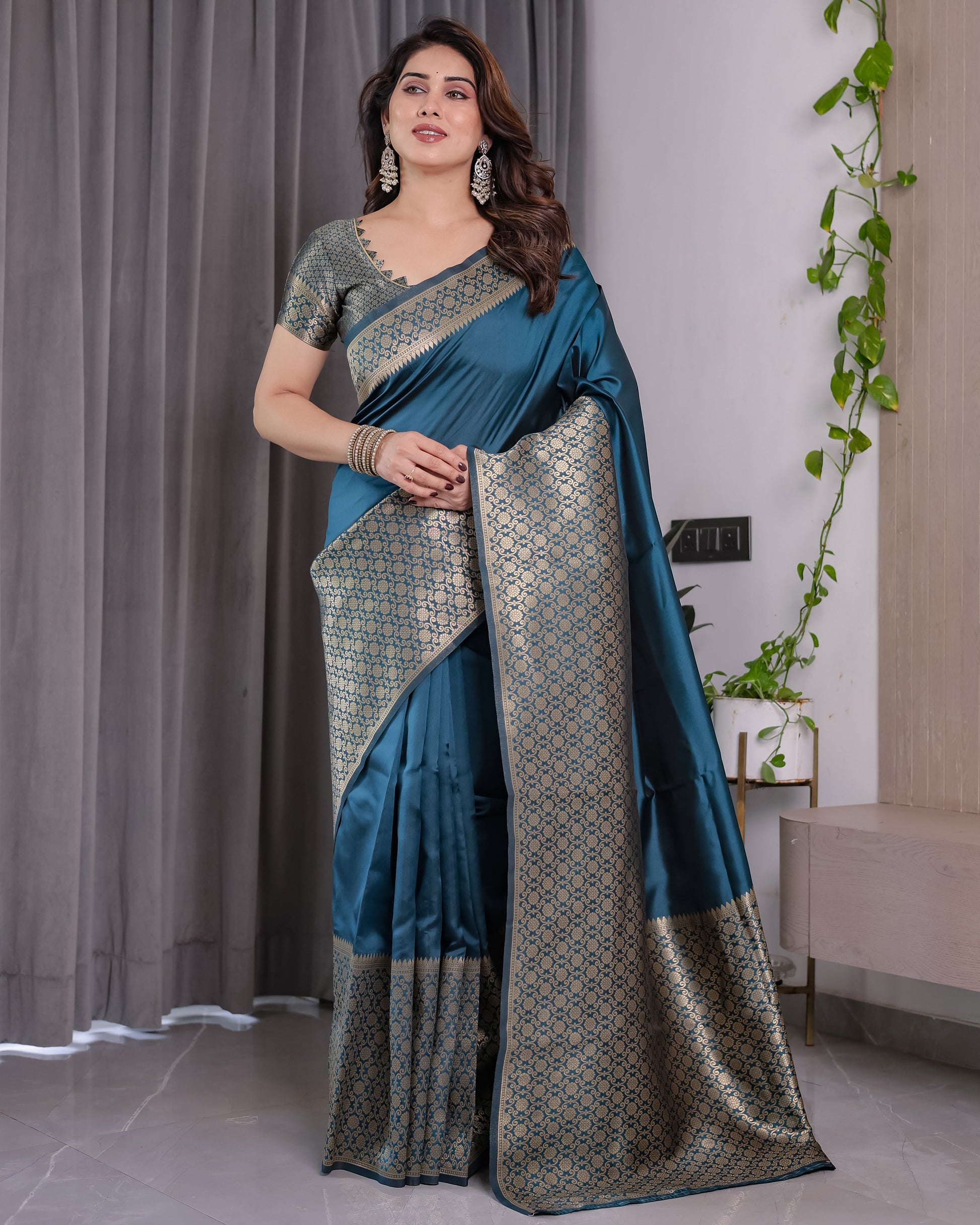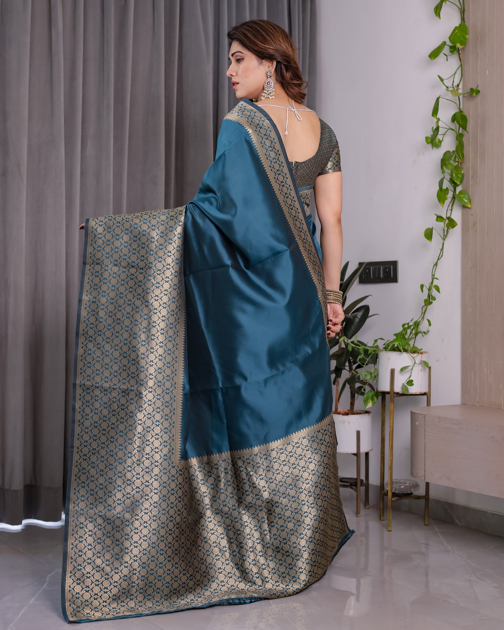 Color: Teal Blue with golden jacquard detailing