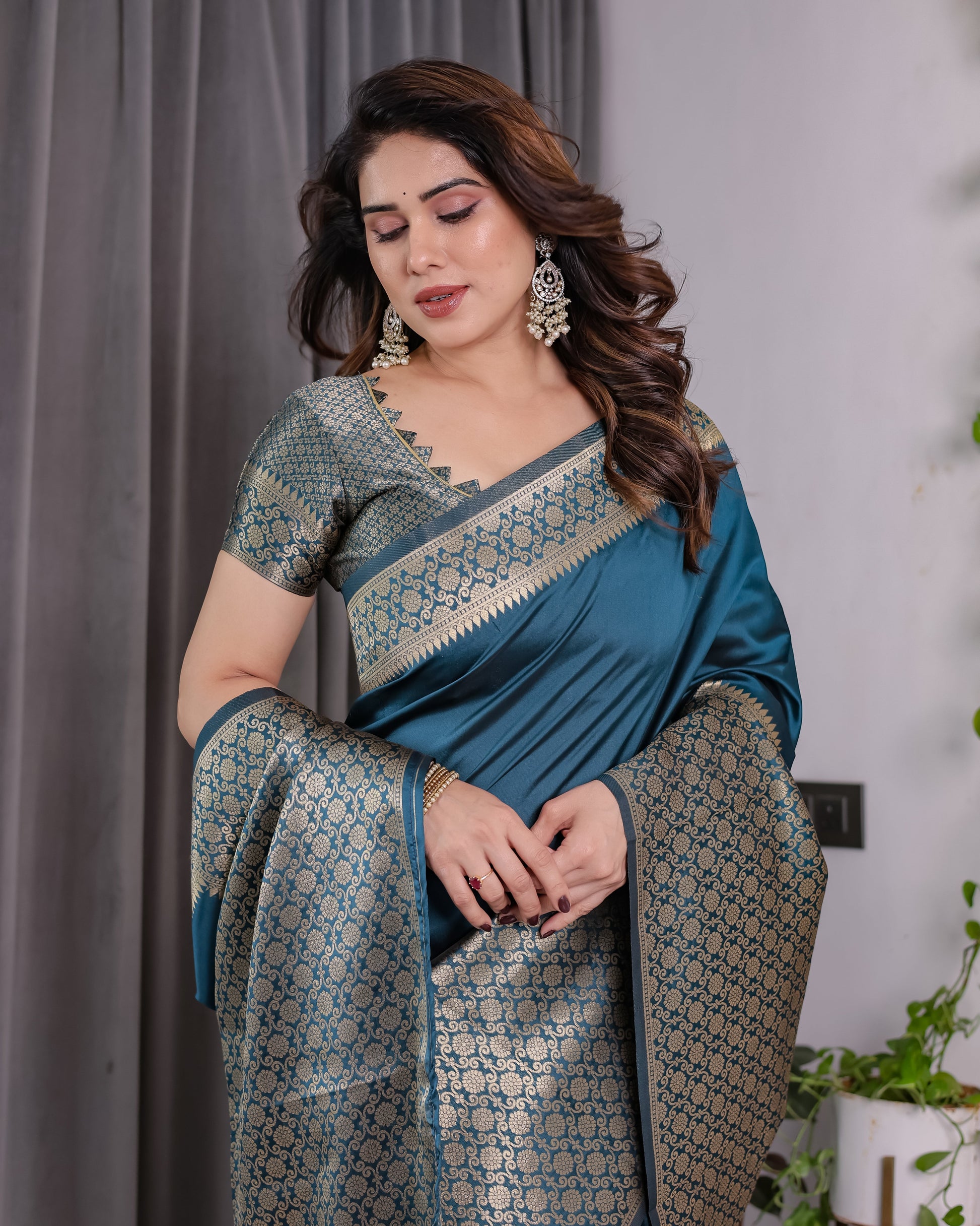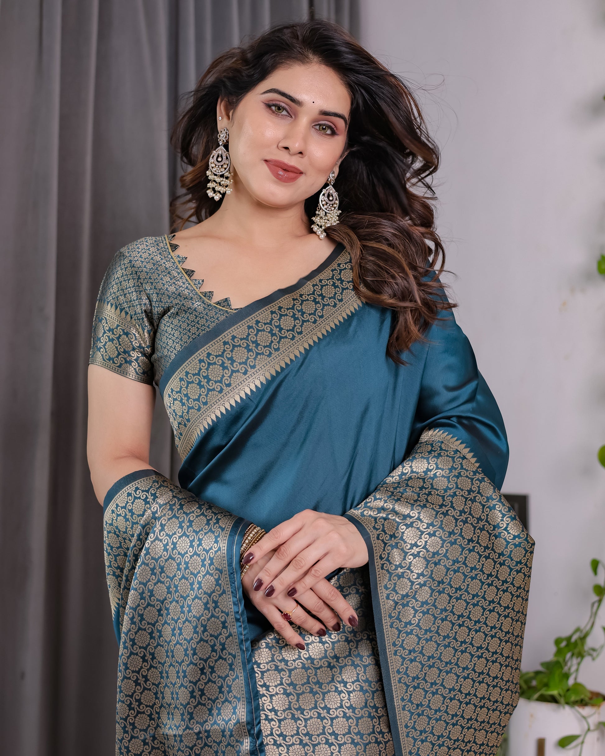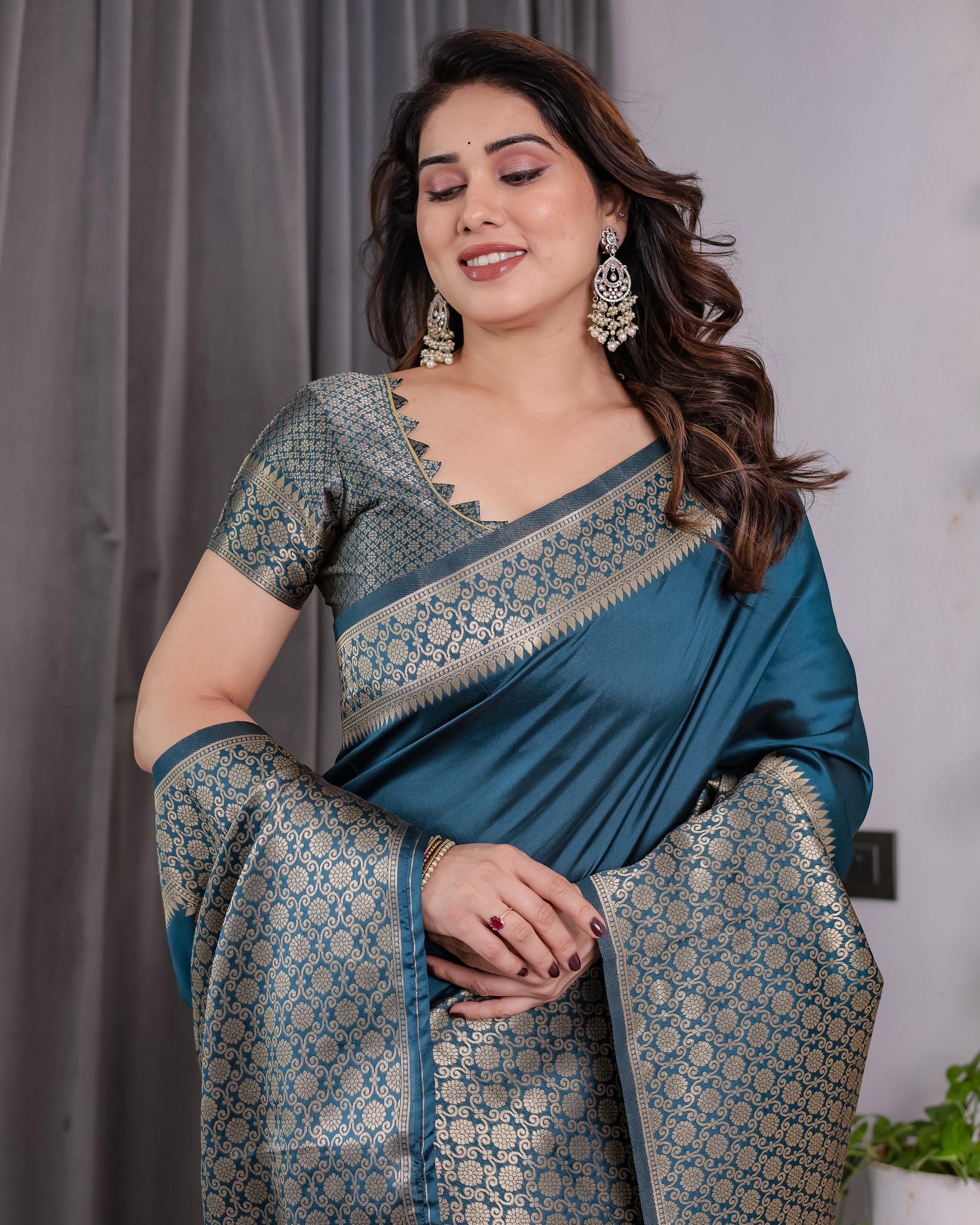 Color: Teal Blue with golden jacquard detailing