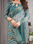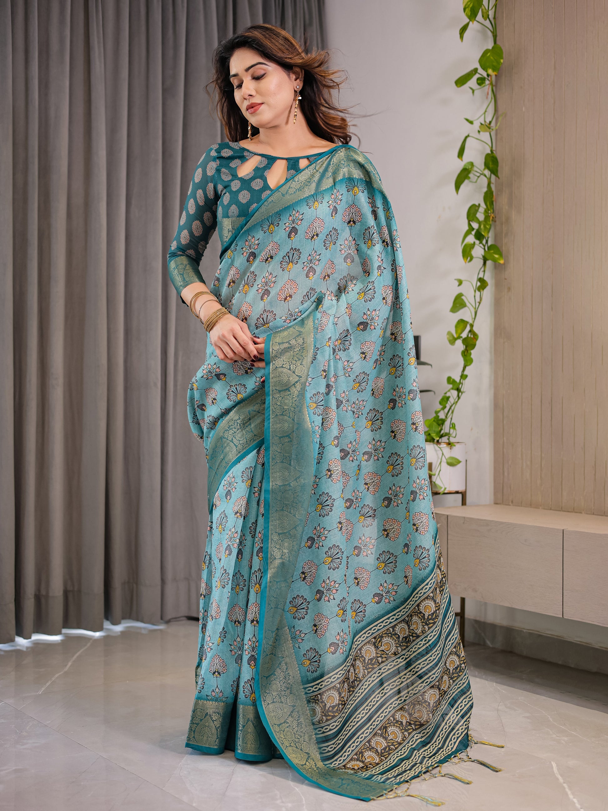 Refresh your ethnic wardrobe with this serene turquoise blue cotton linen saree, adorned with charming digital floral and peacock-inspired motifs. The saree's surface features alternating stylized feathers and floral blooms, invoking a calm, artistic feel that is both soothing and luxurious.