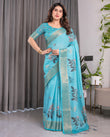 Turquoise Blue Handloom Linen Saree with Floral Digital Print & Golden Zari Border | Tassel Detailing | Attached Blouse | 5.5m Saree + 0.8m Blouse