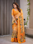 Celebrate culture and color with this radiant orange cotton linen saree that beautifully merges traditional vibrancy with artistic elegance. The body is dipped in a bright marigold hue, subtly shaded and finished with fine zari weave for a regal touch.