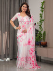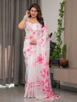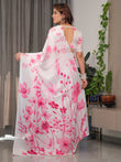 White Satin Georgette Pink Floral Printed Saree with Attached Blouse – Soft Flow Designer Saree for Elegant & Festive Wear