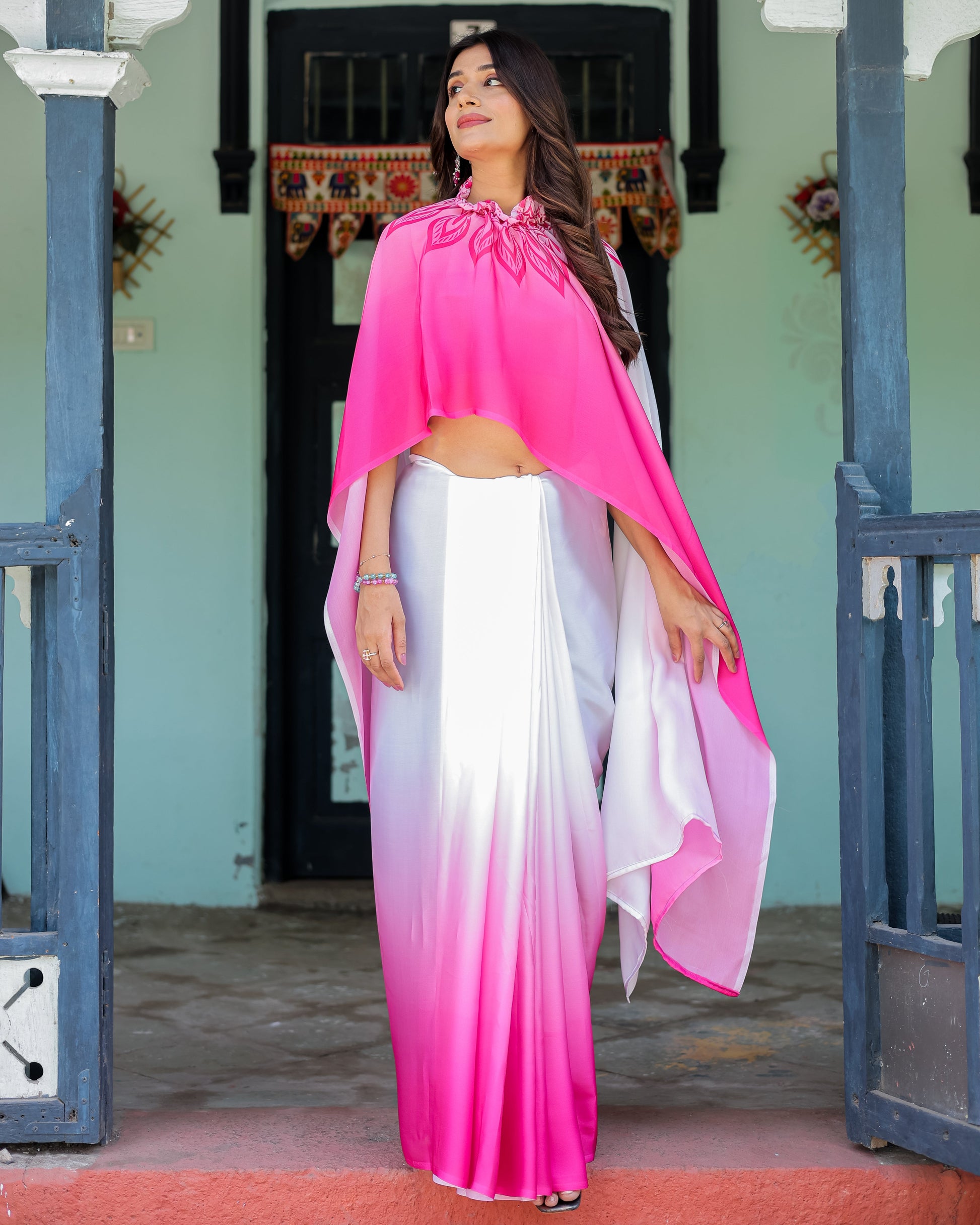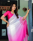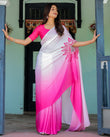 Elegant and vibrant, this White & Pink Ombré Designer Saree is a timeless addition to your ethnic wardrobe. Crafted from soft satin georgette, the saree flows from a pure white base into a rich pink gradient, creating a graceful, fluid look. The standout feature is the bold leaf mandala motif around the pallu loop, designed for handsfree, pin-free draping that stays stylish all day.