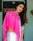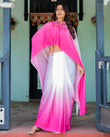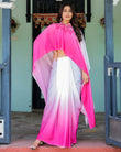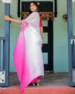 White & Pink Ombré Satin Georgette Saree with Bold Leaf Mandala Pallu & Hot Pink Blouse | Handsfree Pallu Loop