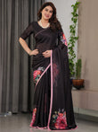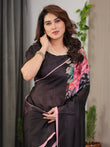 Black Satin Georgette Floral Printed Saree with Soft Pink Border & Attached Blouse – Elegant Designer Partywear Drape