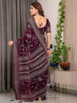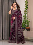 The deep wine plum base is adorned with bold leafy floral block-printed motifs, enhanced with subtle foil detailing that adds depth and festive brilliance. The saree is beautifully framed with a broad geometric ornamental border and a richly detailed pallu, blending traditional craftsmanship with modern design sensibilities.